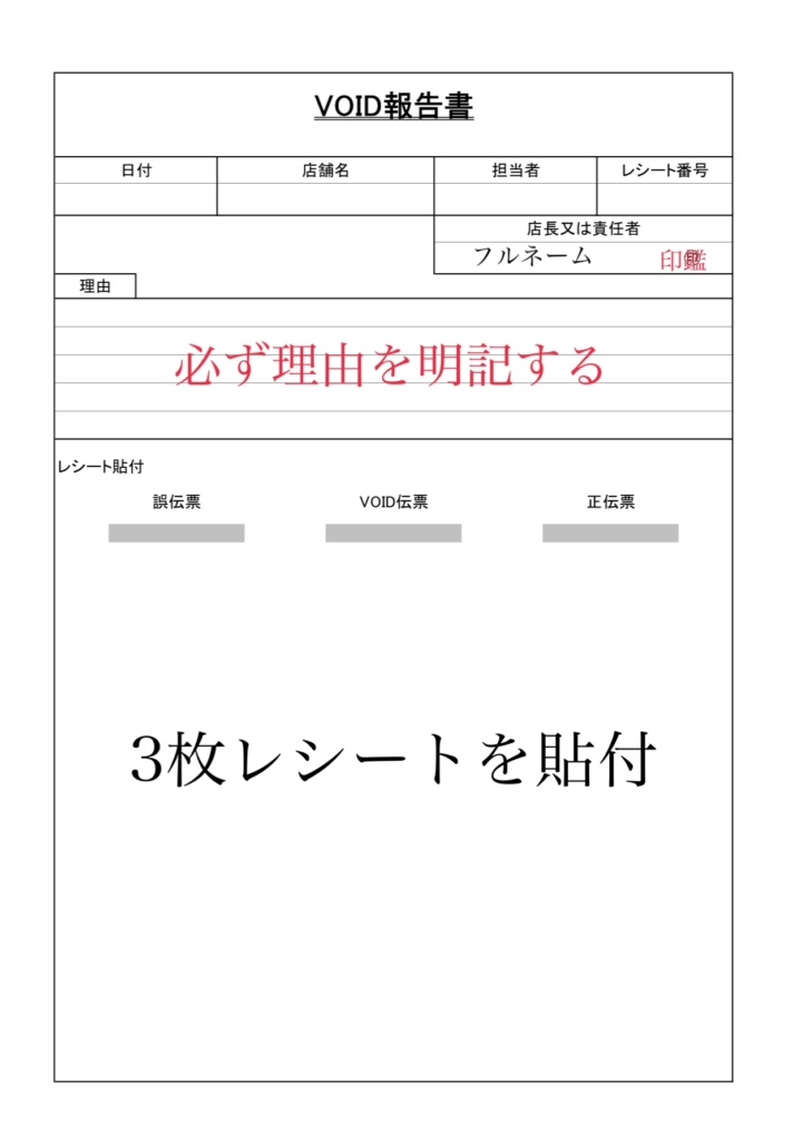 ③誤伝票(ミスのあった会計伝票)・VOID伝票・正伝票の3枚を貼付