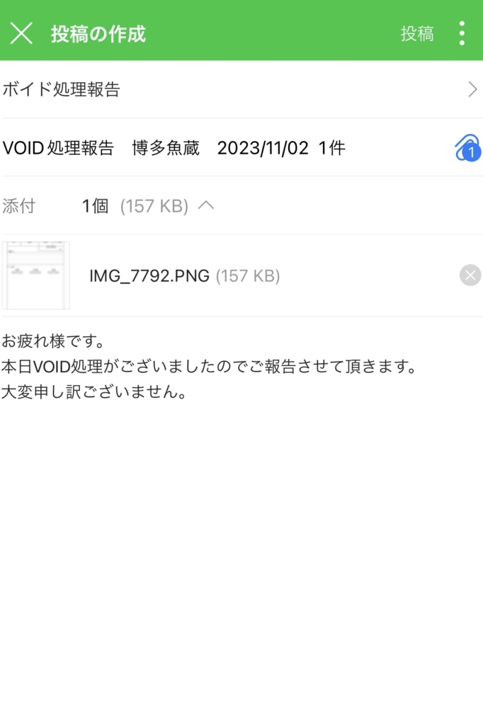 ②ラインワークス上の「ボイド処理報告」の掲示板に以下のように投稿する。