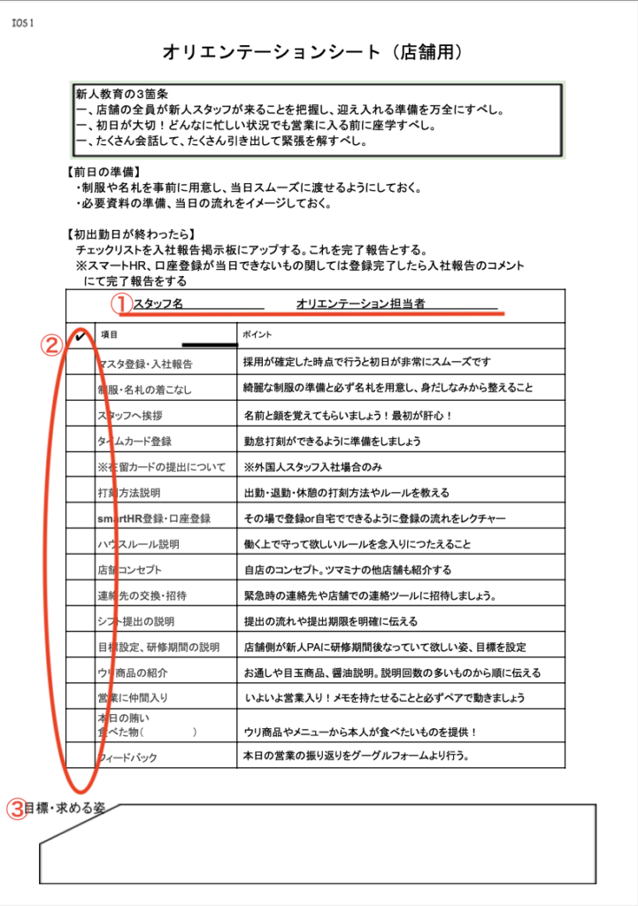 ・オリエンテーションシート(店舗用・新人スタッフ用) 各1枚
