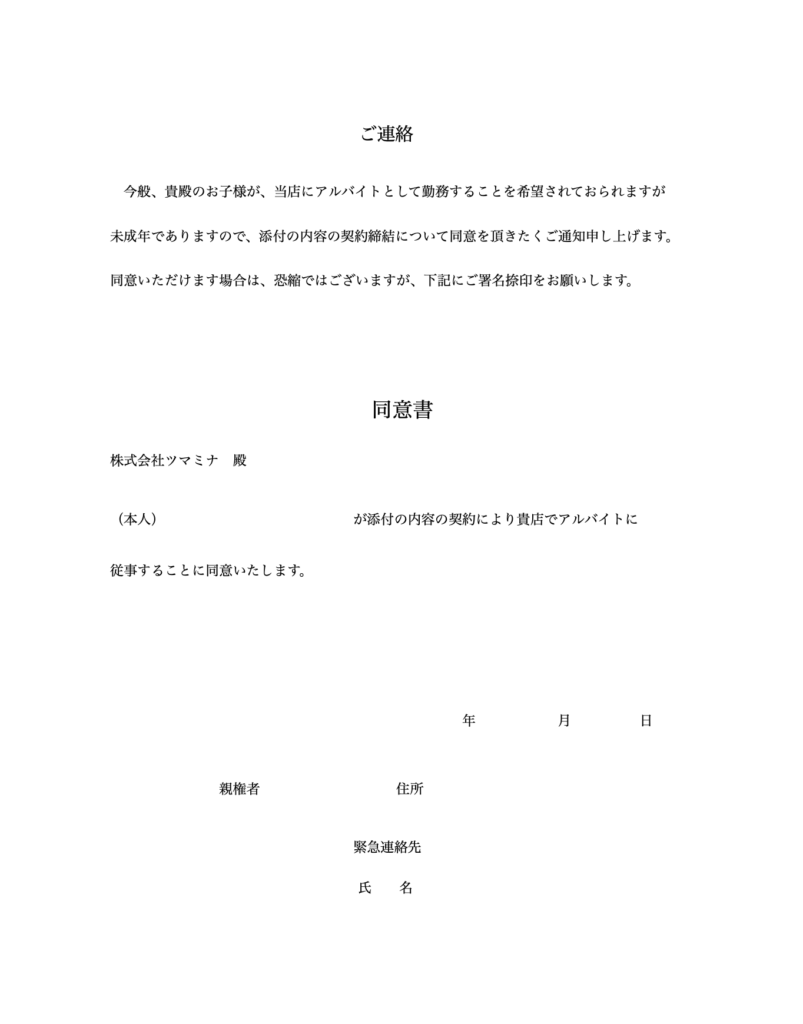年少者(未成年)が勤務する場合は親権者の同意書が必要になります。