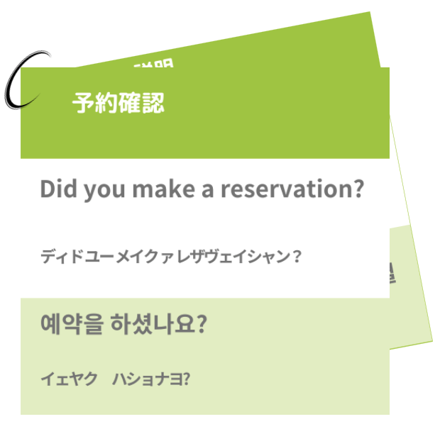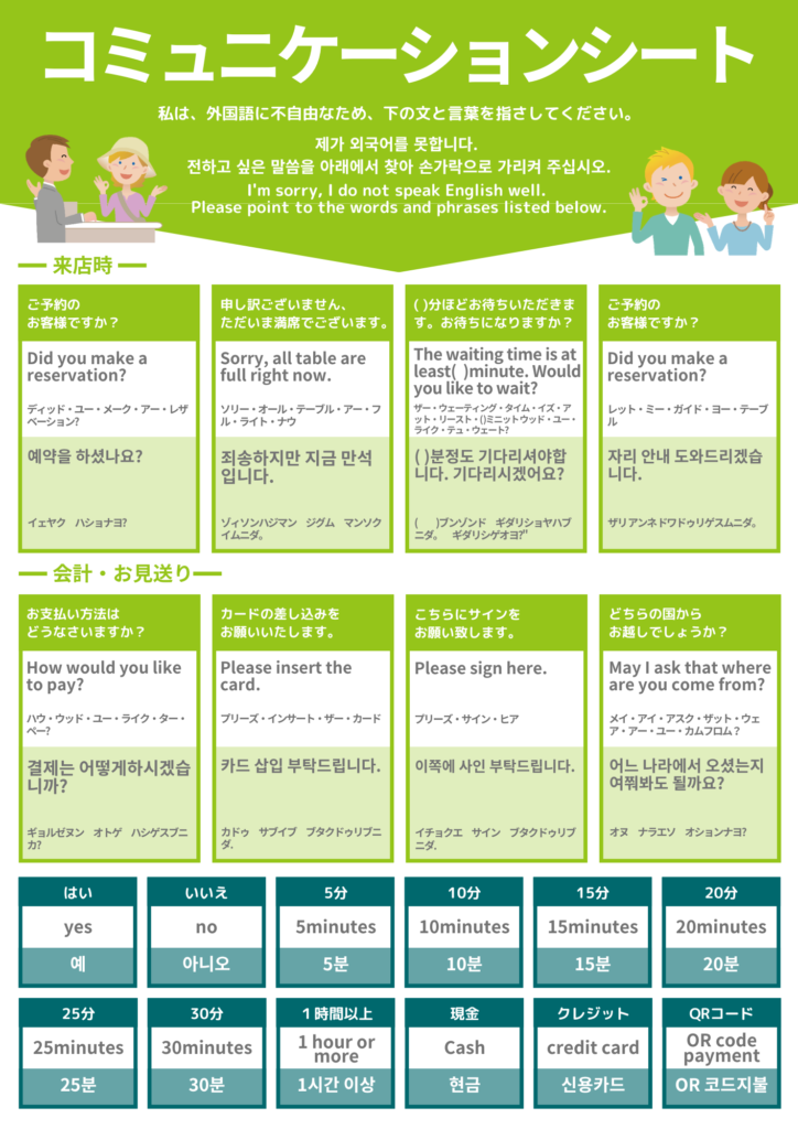 まずは、歓迎する気持ちと笑顔で迎えることが一番大切です。言葉は通じなくても、感情や気持ちは共有されるので、常に心がけましょう!現場で起こりうる言語の障壁や接客の困難を解消するために、コミュニケーションシート&カードを作成しましたのでぜひご活用ください。
